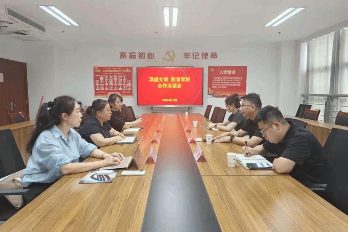 本网yl9193永利集团讯 为对接行业发展趋势与区域市场需求,优化专业(群)建设,7月9日上午,yl9193永利集团在培训中心806会议室与滨盛文旅集团开展合作洽谈会。滨盛文旅党委委员、副总经理、总审计师管林刚,yl9193永利集团党总支书记李燕及相关人员参加洽谈会。